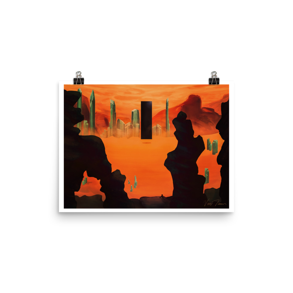 a 16x12 art print of my 2021 illustration "The Monolith Floats Through the Microcrystalline Desert". this is printed on "enhanced matte poster paper" and the order is fulfilled through printful. the printed versions DO NOT have the watermark. if you would like a $1+ digital copy as a wallpaper instead, that's available as a separate listing! [printful charges 11 dollars plus shipping for fulfillment. Gumroad keeps about 3 dollars. At 20 dollars + 5 dollars shipping (10 for australian customers due to higher fees) I make roughly 4 per print. supply chain issues have created increases in some fees, which may impact the calculation of cost. changes in UK laws regarding VAT may also impact the cost for UK customers temporarily]