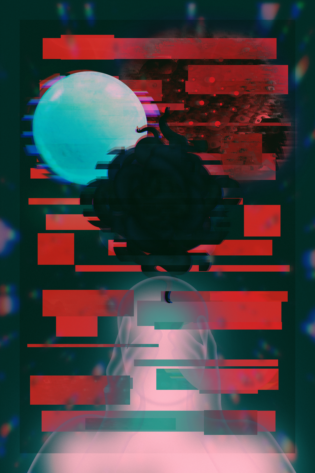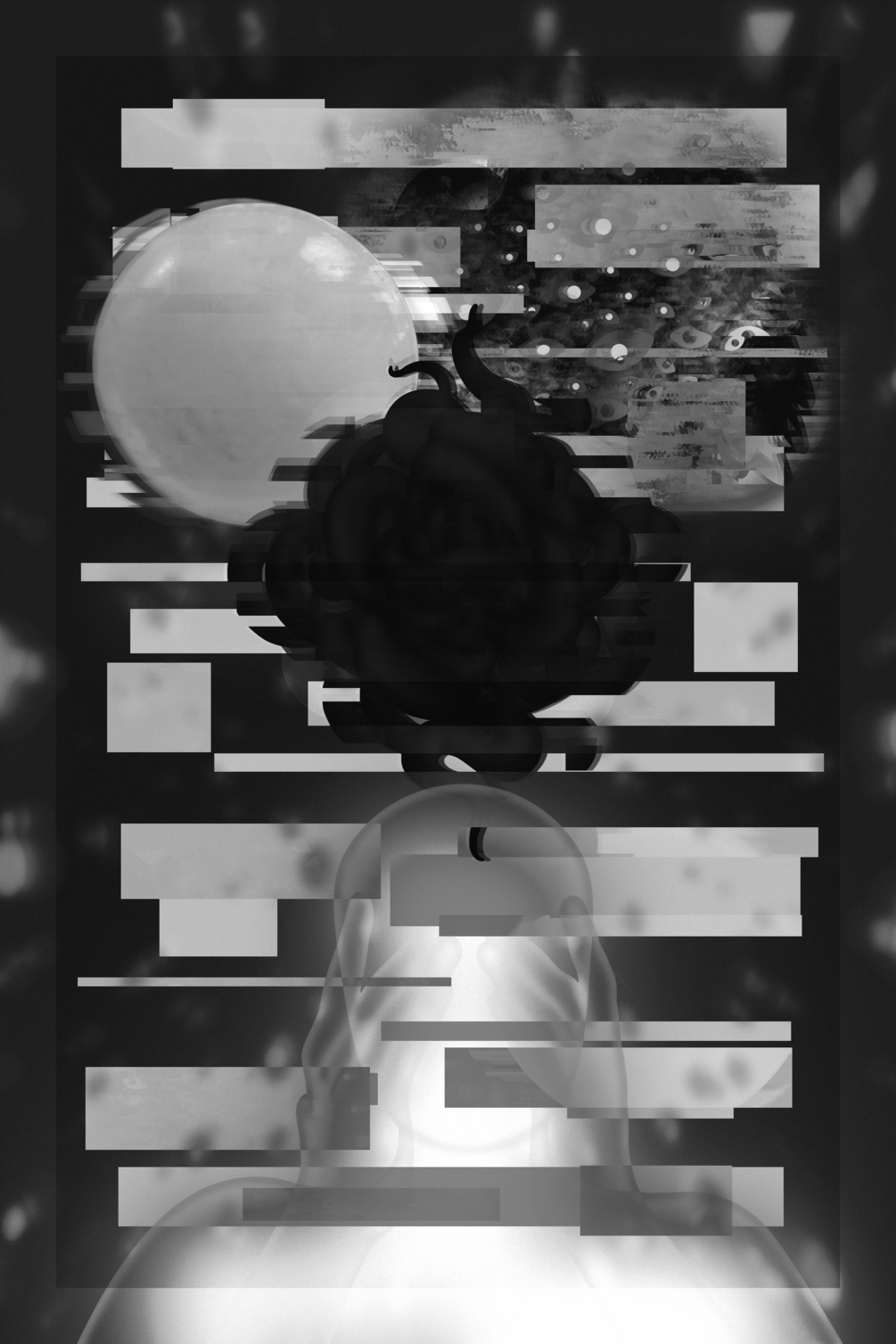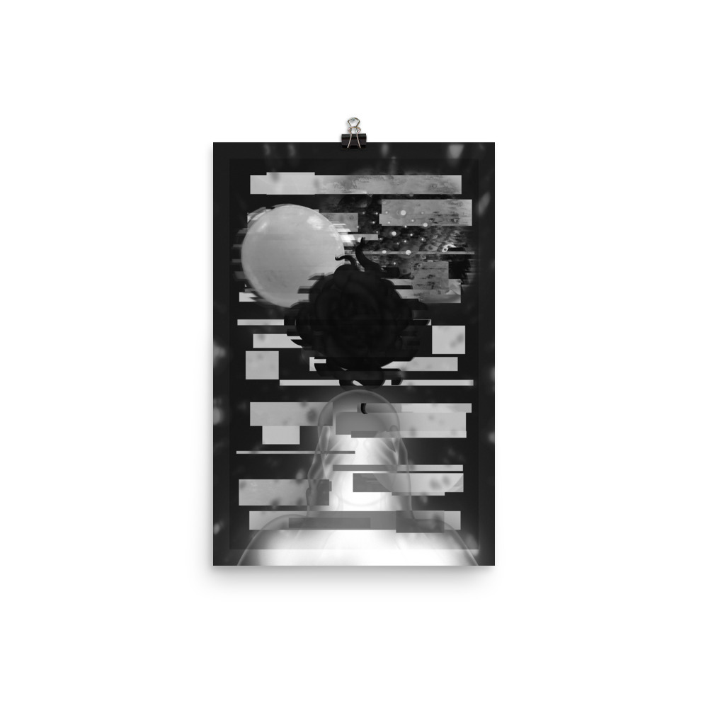 a 12x18 art print of my 2020 illustration "Deo Volente". this illustration was made for a flash fiction story I wrote by the same name, which you can read here. this is printed on "enhanced matte poster paper" and the order is fulfilled through printful. there are 4 color variations in this order: color glitch, color simple, black and white glitch, and black and white simple. []