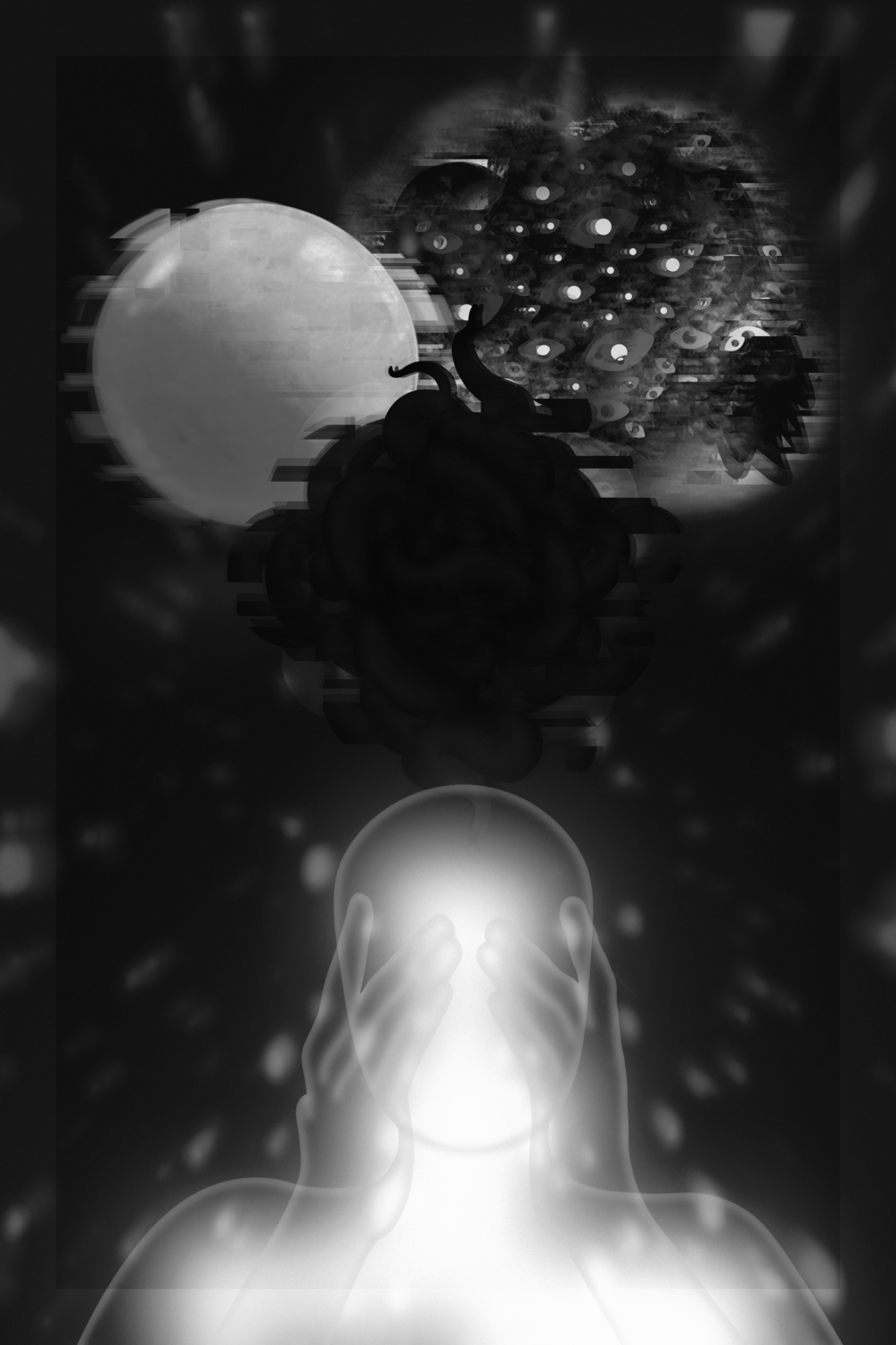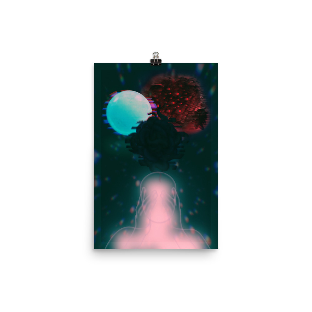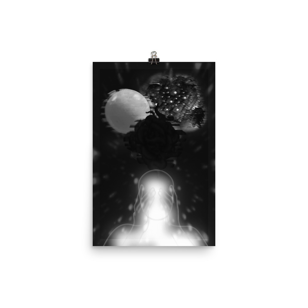 a 12x18 art print of my 2020 illustration "Deo Volente". this illustration was made for a flash fiction story I wrote by the same name, which you can read here. this is printed on "enhanced matte poster paper" and the order is fulfilled through printful. there are 4 color variations in this order: color glitch, color simple, black and white glitch, and black and white simple. []